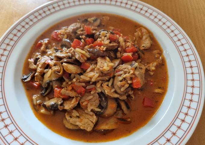 - Tomatenmark, Champignons und Paprika dazugeben und kurz mit anbraten. Mit Brühe ablöschen und 15 Minuten mit geschlossenem Deckel köcheln lassen..